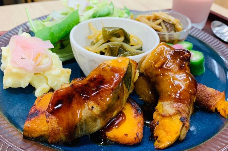 2023/10/11めぐみキッチンでは、めぐみ農園で採れた旬のお野菜を使った新メニューが登場しています。 10月から、秋の新メニューとして「かぼちゃのAプレート」が登場しました。 カリカリのお肉に巻かれたほくほくで甘いかぼちゃ。 そこへおしょうゆベースの「甘辛たれ」がかかっていて、ご飯がすすみます! ピーナッツかぼちゃのスープや紅酒粕で作った砂糖不使用の甘酒が日替わりでついてきますよ!! 美味しくてボリ... -