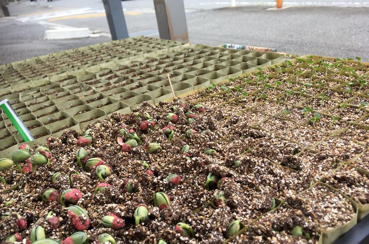 苗床で次々に発芽しているところは、店舗の前で見られます。