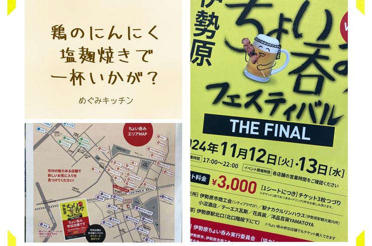 只今開催中の「ちょい呑みフェスティバル」も、めぐみキッチンではおつまみの「鶏のニンニク塩麹焼き」とドリンクのご提供を予定しており、参加チケットはまだご購入いただけます。秋の伊勢原を満喫しに、ぜひ遊びにいらしてください!